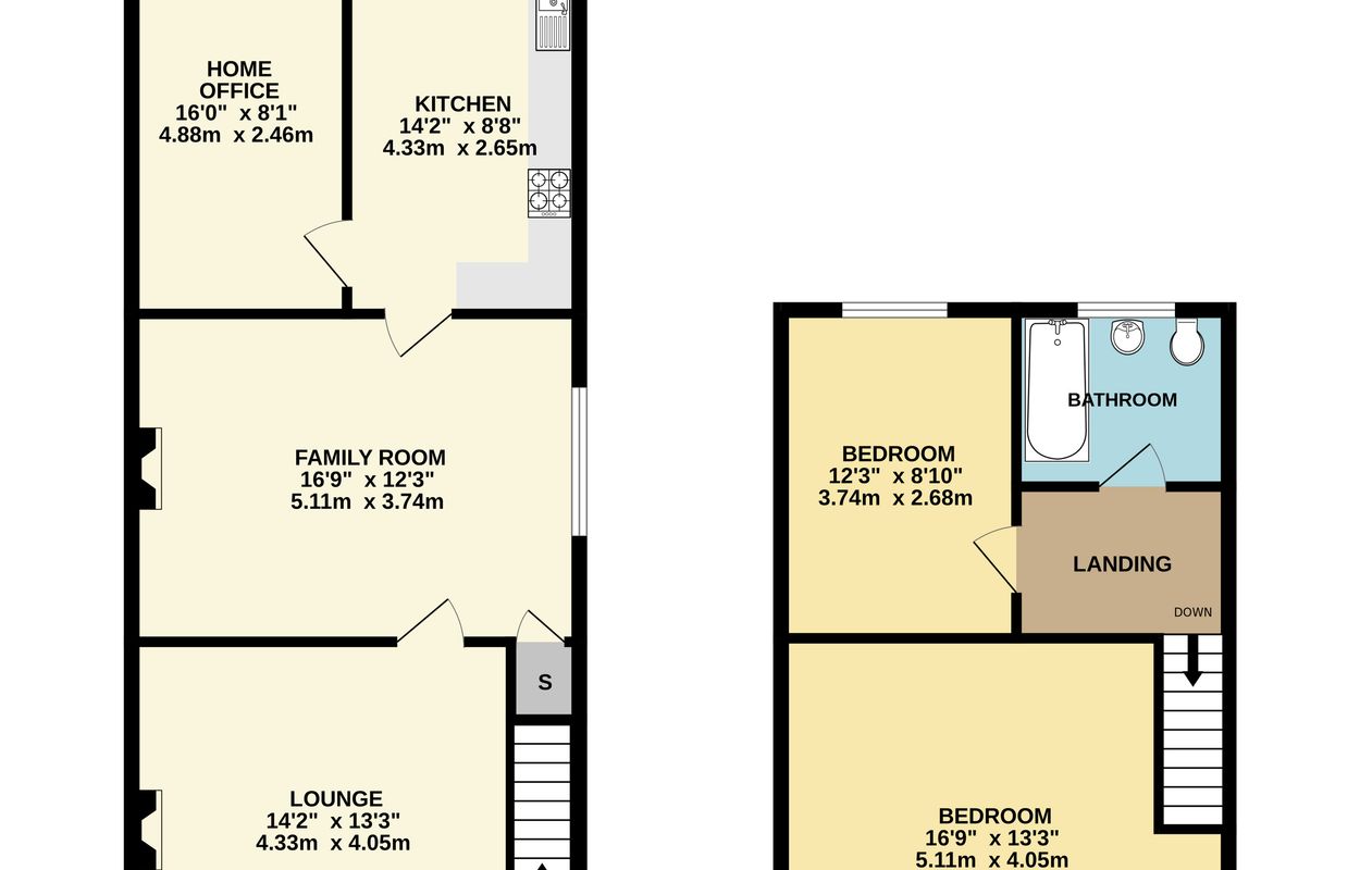 The property is partially renovated and ready for finishing touches, allowing the next owner to create their ideal home. The ground floor comprises an entrance hall, a lounge, a separate dining/sitting room, a kitchen, a useful office space, and a ground-floor WC. Upstairs, there are two double bedrooms and a good-sized family bathroom.